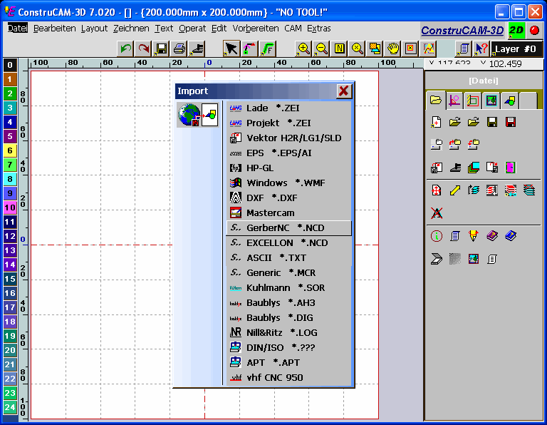ConstruCAM-3D does not only provide interface for most standard formats, i.e. EPS, HP-GL, DXF or DIN/ISO, but also to the most important known engraving systems i.e.LANG, Kuhlmann, Baublys, Einzinger, Isel, etc. ( not in ConstruCAM-3D for WIN PCNC )
