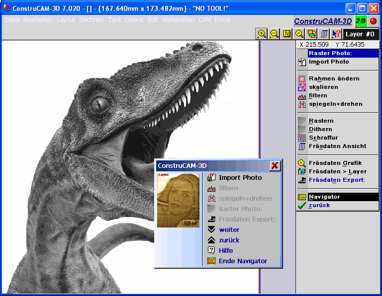 The imported pictures can be edited, scaled, filtered, mirrored and with grids or dithers quickly converted into milling data with the RasterCut menu.