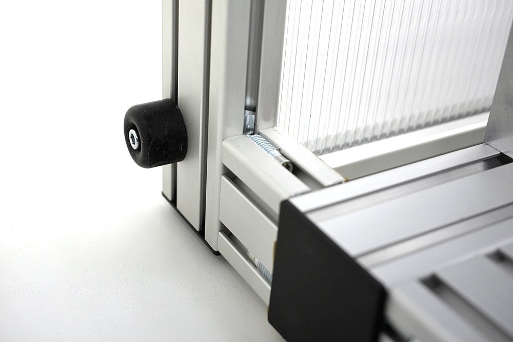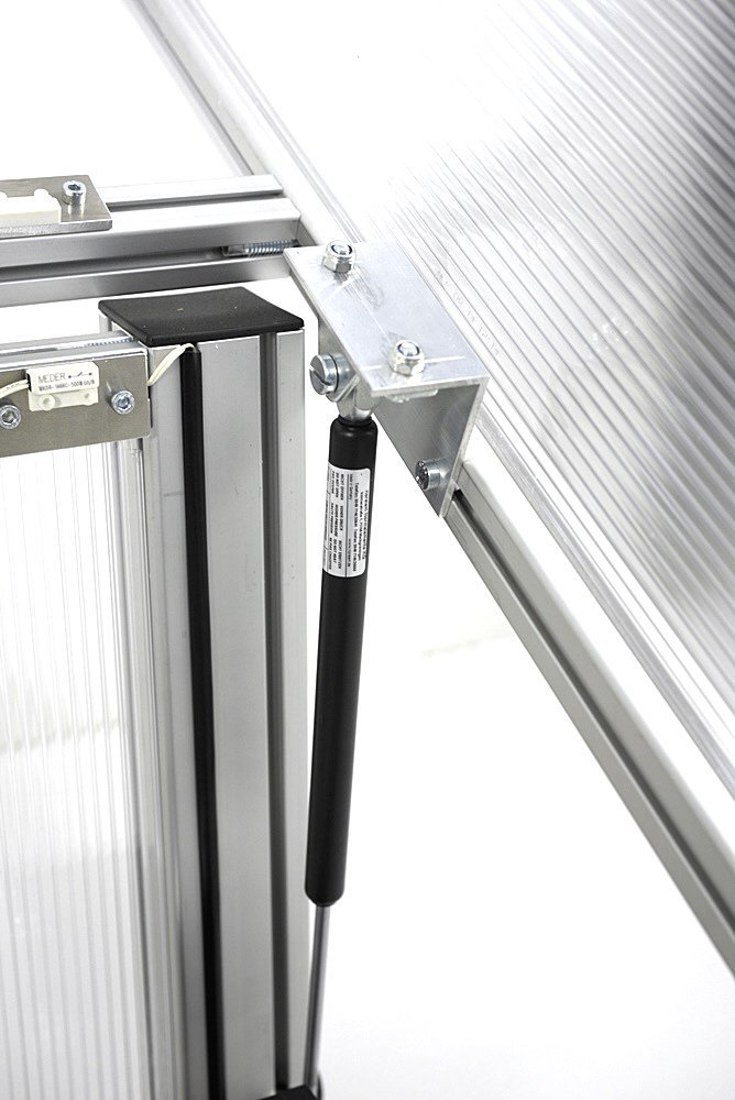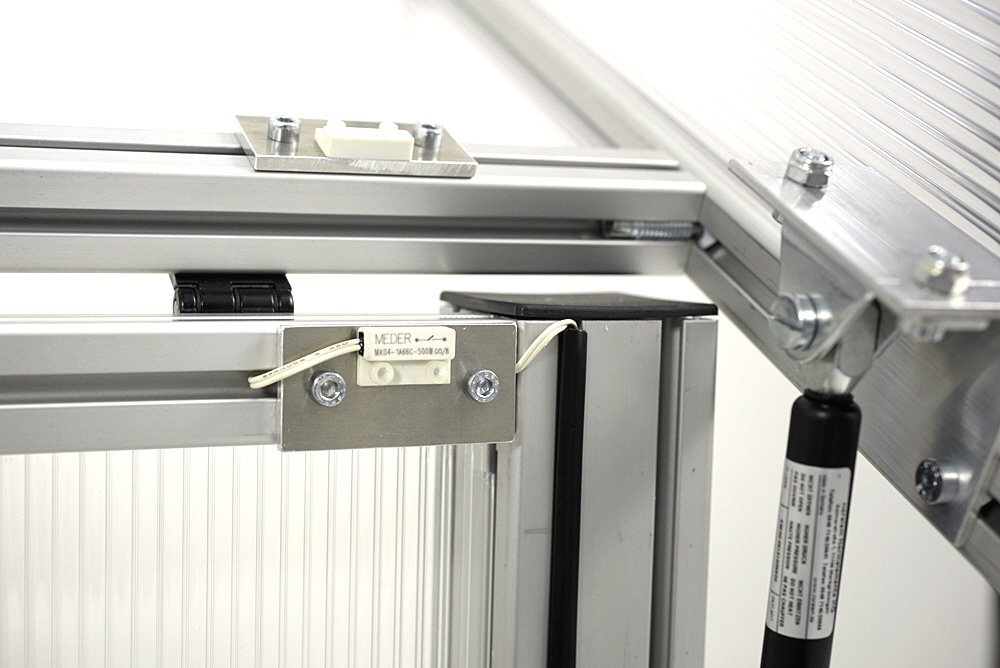 Due to the built-in gas spring, the safety enclosure is opened and closed without any effort. The gas pressure damper supports the enclosure exactly at the right moment of the opening and thus ensures an extremely easy-to-operate and secure operation.