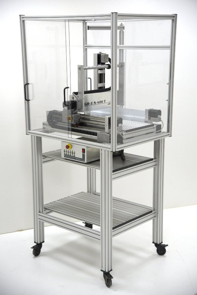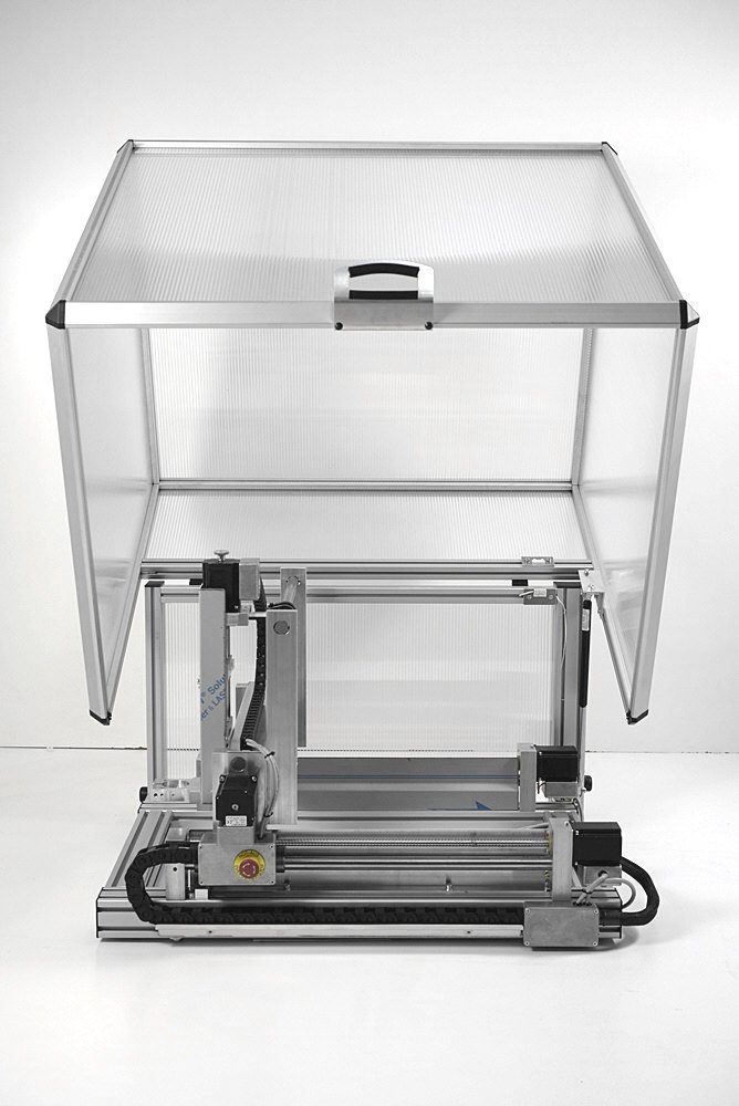 The safety enclosure with the gas dampers is ideally suited if you want to place the CNC milling machine on an 80-90 cm high workbench or other work surface. The cable can be discharged directly downwards through the table or through the feedthrough provided in the fixed rear part at the lower right.