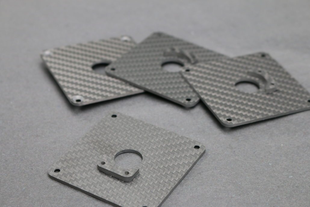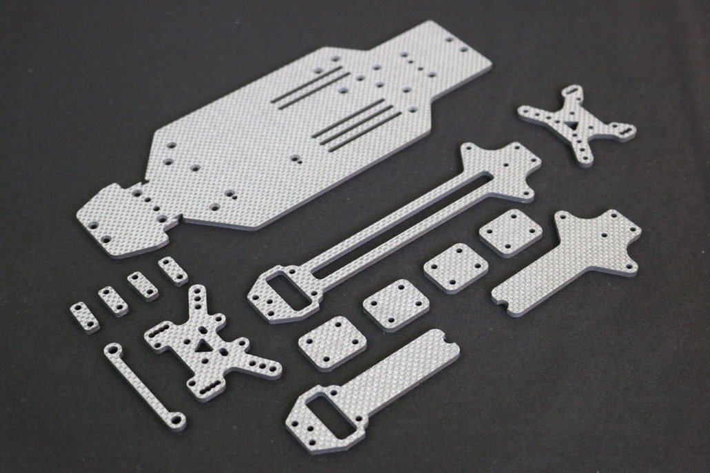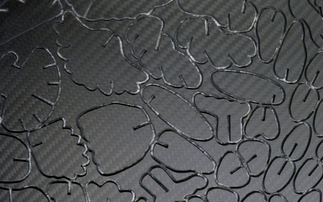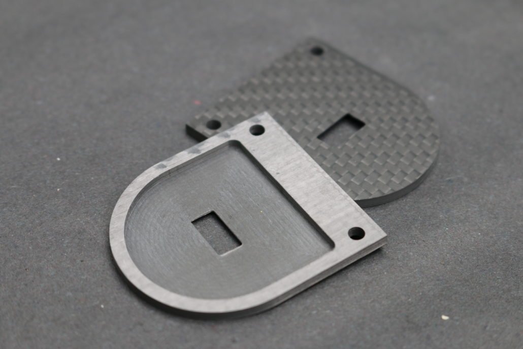 Carbon parts for a flying object model with clean cutting edges, drill holes and cut-outs.