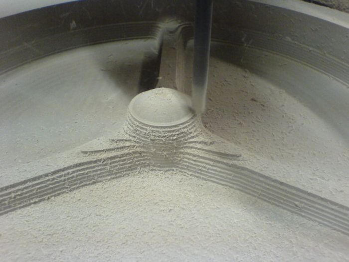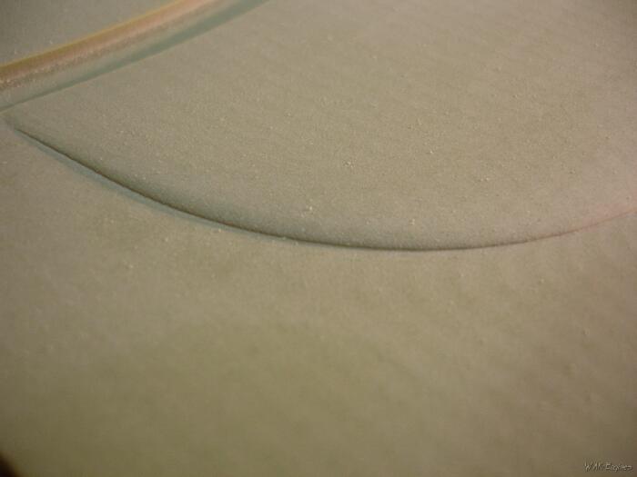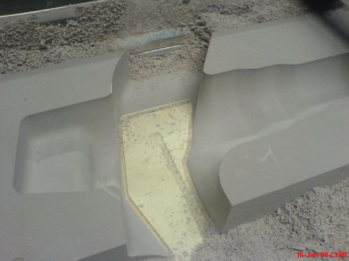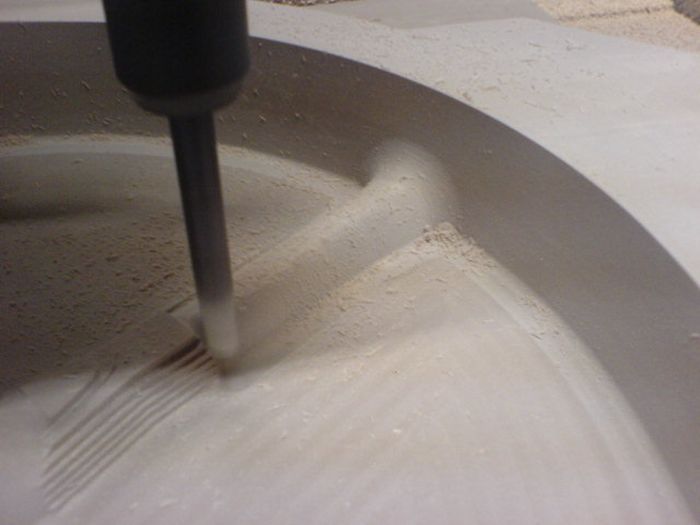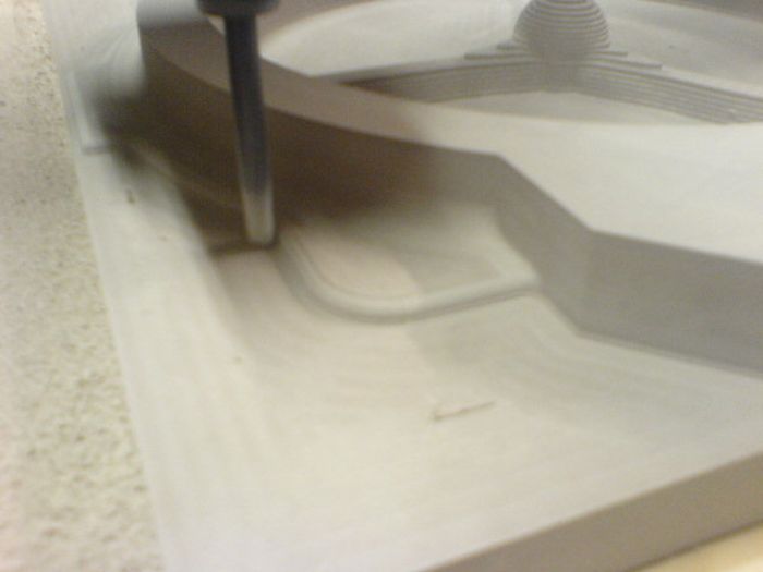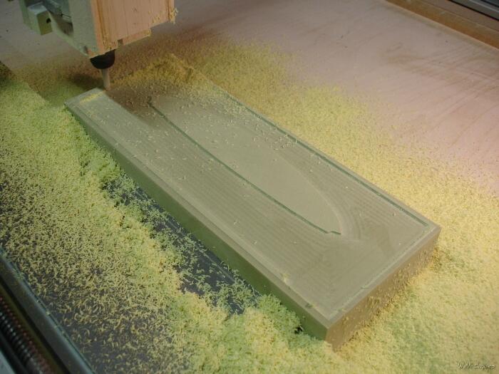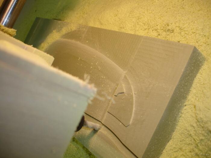 The feed speed is 100 mm per second, 6 meters per minute. The complete form with a size of approx. 600 x 450 x 140mm was completed in only approx. 15 minutes. In these materials, one could, for the sake of saving time, forego the pre-milling and finish the workpiece directly with a small distance between the tracks.