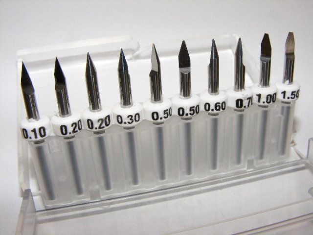 Engraving bits, font width 0.1 – 1.5mm for precise engravings in steel, brass, aluminium, glass and plastic. Suitable for CNC engraving machines.