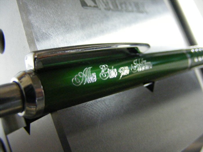 Scratch engraving / diamond engraving on curved and curved surfaces and parts is also feasible due to the travel of the diamond engraving holder. In the example we show an engraving on a corkscrew made of anodised aluminum and a diamond engraving on a strongly bent part, a ballpoint pen.