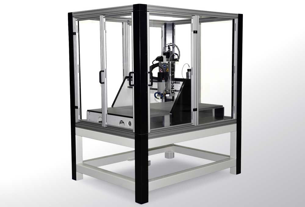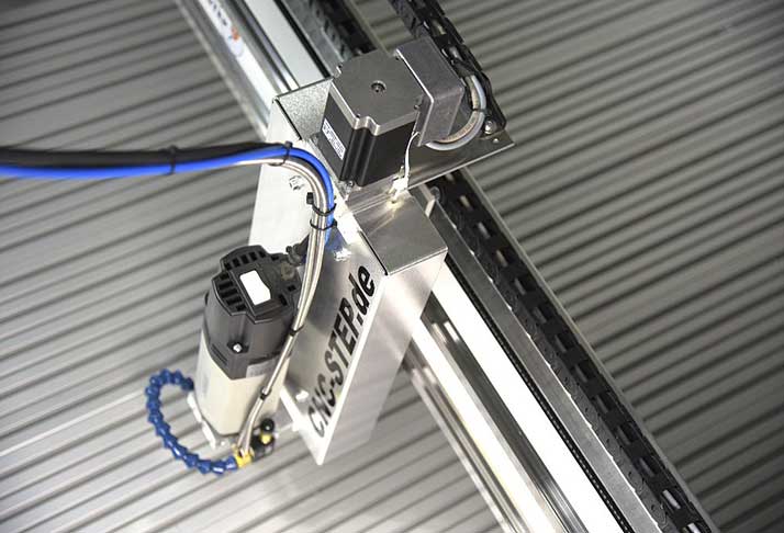 The CNC machine is completely made for 2D or 3D milling of steel and stainless steel including softer materials like wood or plastic of course. Extremely stable designed mechanical components combined with 20mm thick HIWIN linear guidings on all axes result in a total weight of 450 kilograms (AceroDURO industrial milling machine with underframe, travel distance 1000 x 1000 mm)