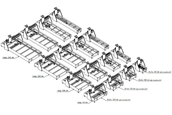 | Axes in mm | X = 500 Desktop Machine with Safety Enclosure | X = 1000 Stand-Alone Machine with Safety Enclosure | X = 1500 Stand-Alone Machine with Safety Enclosure | X = 2000 Stand-Alone Machine with Safety Enclosure |