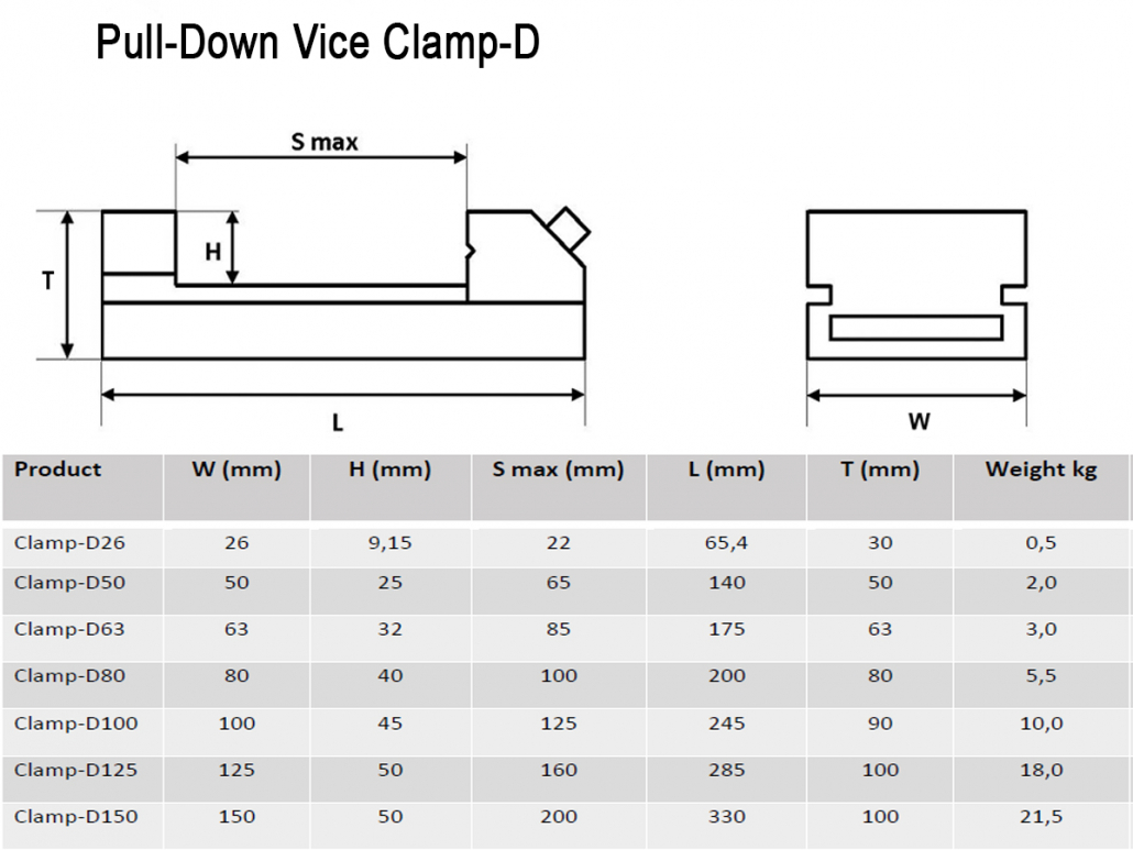 There are seven different sizes of this pull-down vice to choose from, with clamping widths from 22 mm to 200 mm. An angular prism grinding on the movable clamping jaw ensures, on the one hand, firm and secure hold of the workpiece and on the other hand, helps to prevent tilting or slipping.