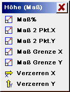 The marked data are converted according to a X (Y) reference dimension in the scale. For this, 2 X (Y) positions are entered using the cursor. The width (height) is displayed and can be replaced by a new value. Following confirmation of input the marked paths are converted in the scale relative to this input. Only the X and Y coordinates (2D) are converted . Possibly existing Z values remain unmodified. |