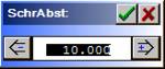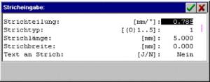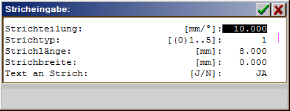 Separation of the graduations in Grad. With line graduation = 0 the graduation is not drawn. Range 0..99.999 mm. |